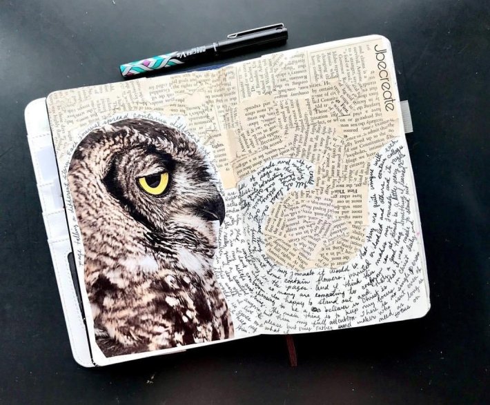 Carfully selected print materials and cursive writing, intertwined with imagery and creative use of animals combines in an interesting journaling style.