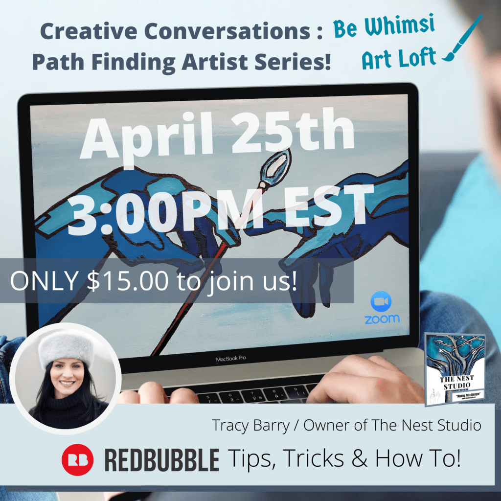 Join us for this discussion and workshop on Sunday, April 25th at 3 pm EST, as Artist and Business owner Tracy Barry hosts an online virtual tour of the Redbubble site, revealing her best tips, tricks, & how-tos for licencing success.